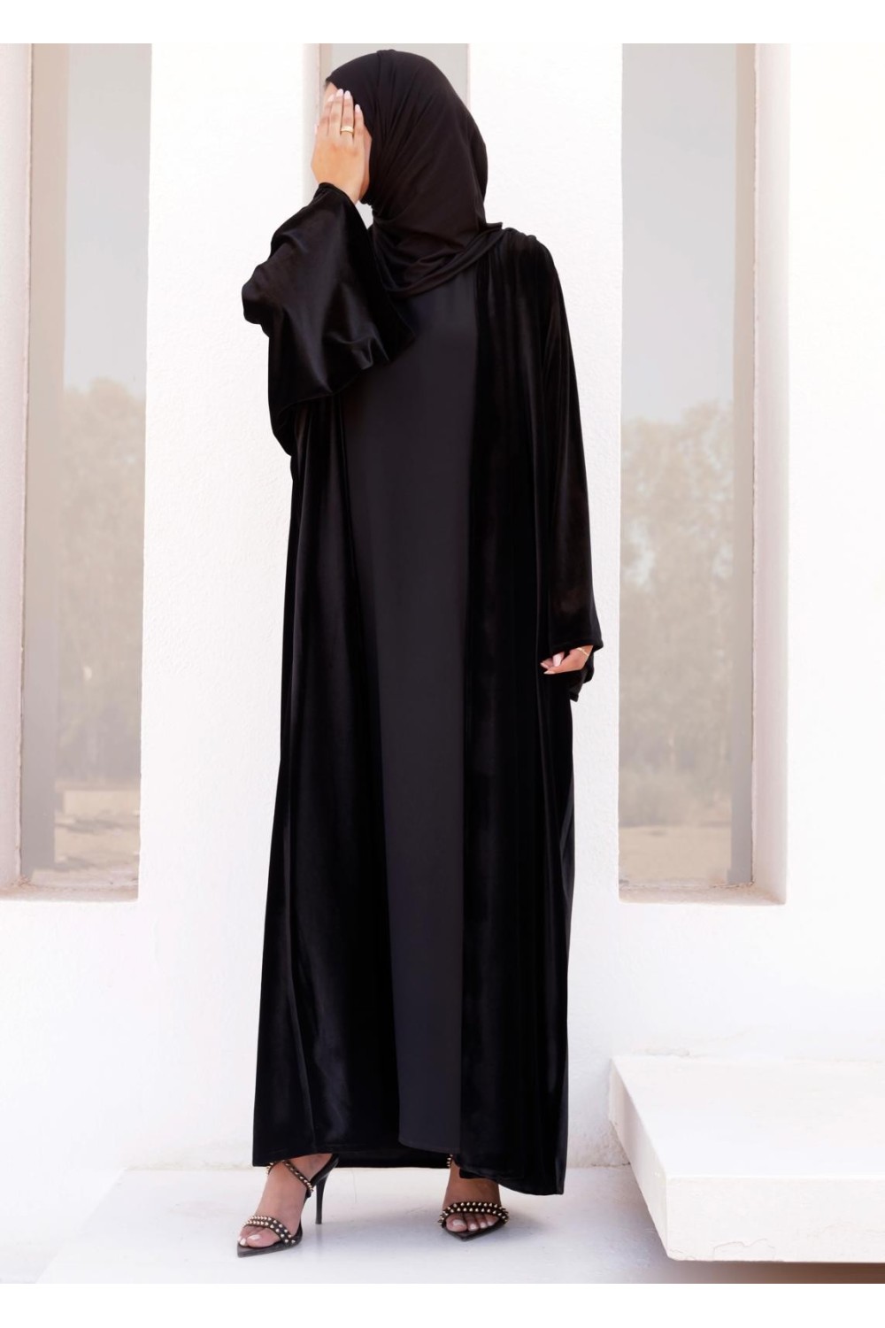 The Velvet abaya, in velvet as its name suggests, with a kimono cut and wide sleeves.