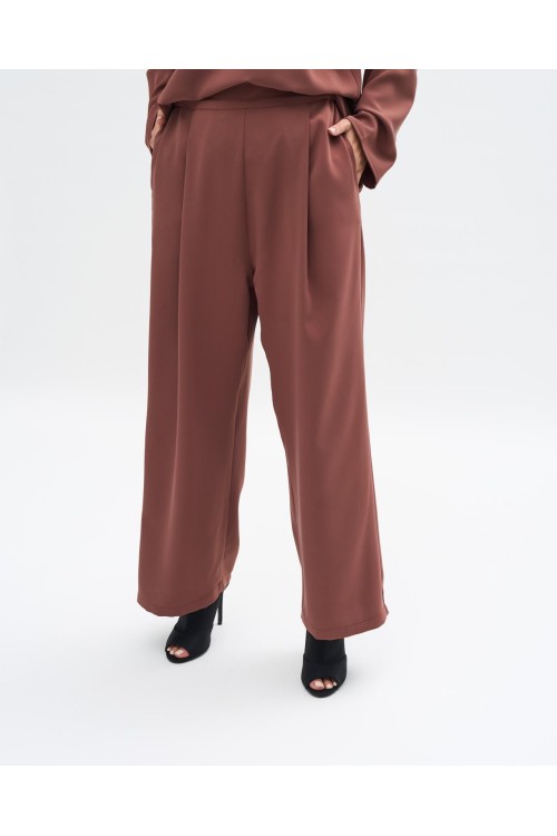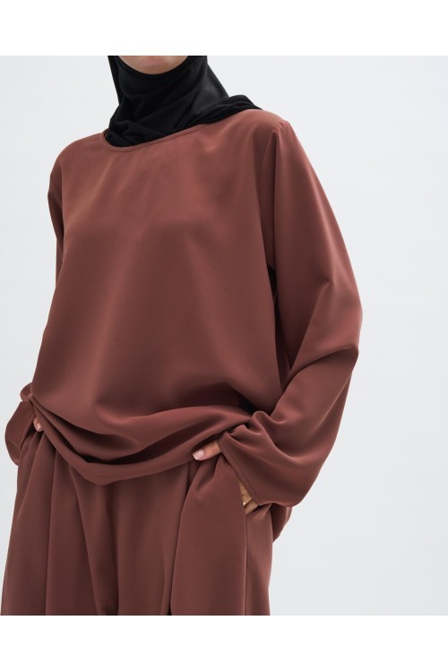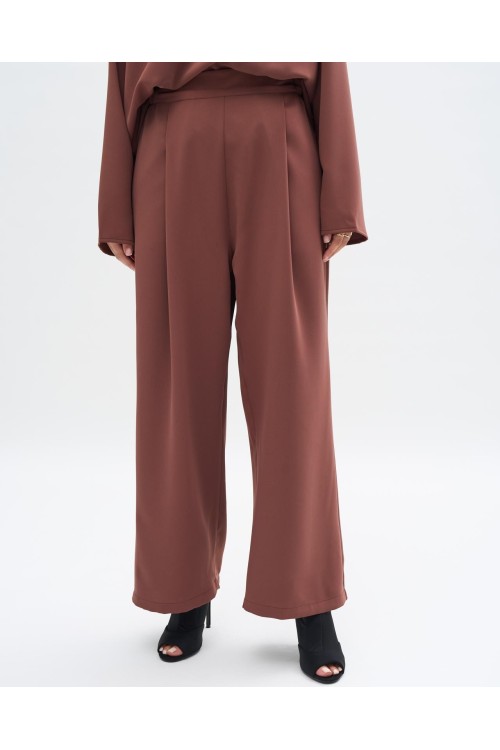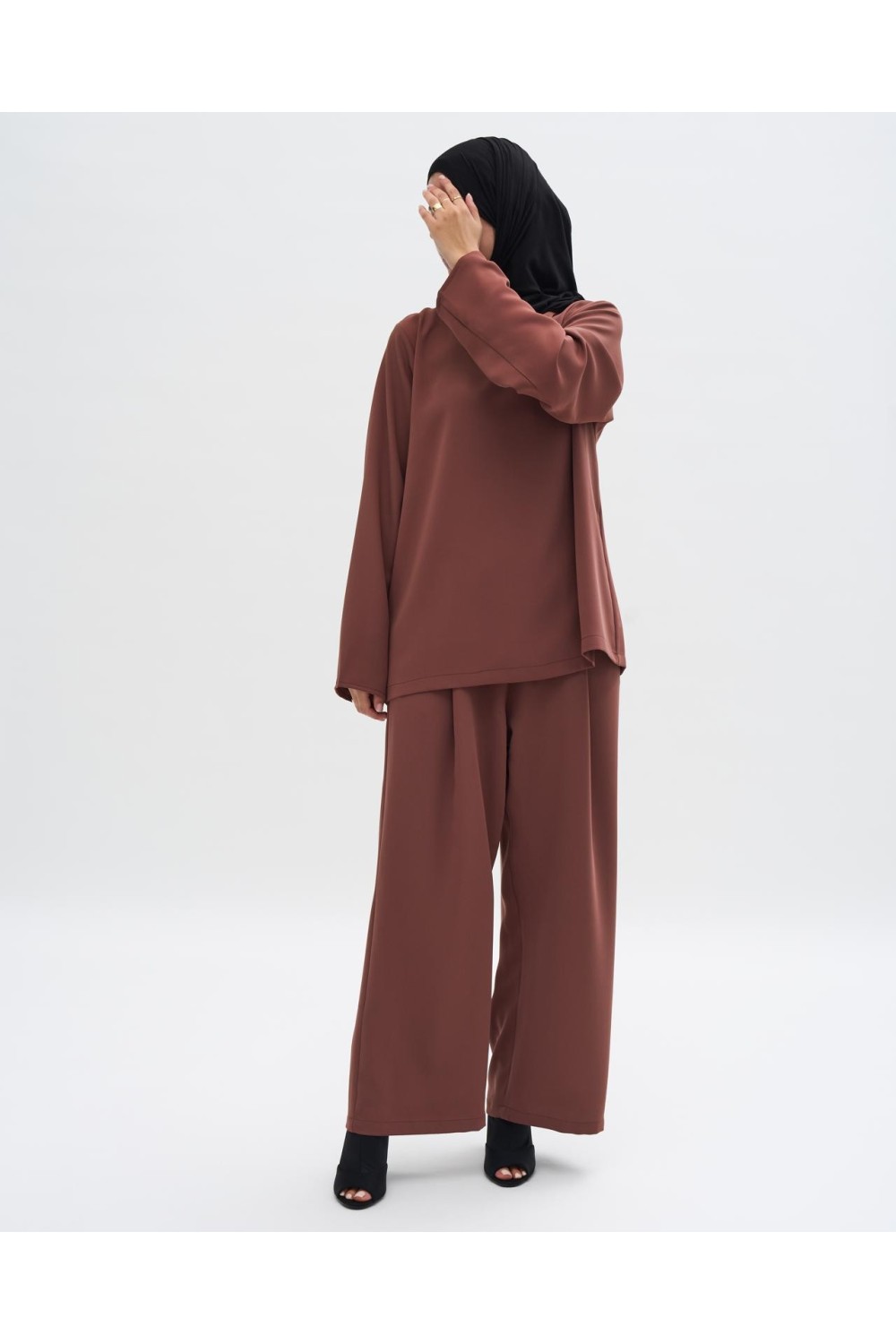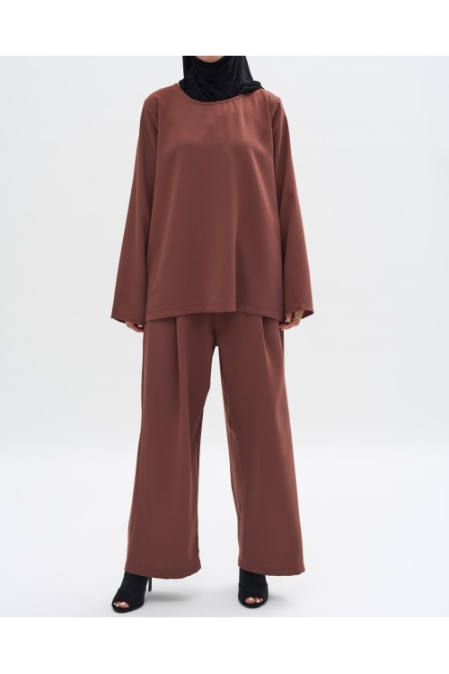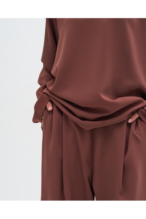 In matte Korean evening crepe, it is made up of a long-sleeved top and a palazzo which has two pockets and elastic at the back.