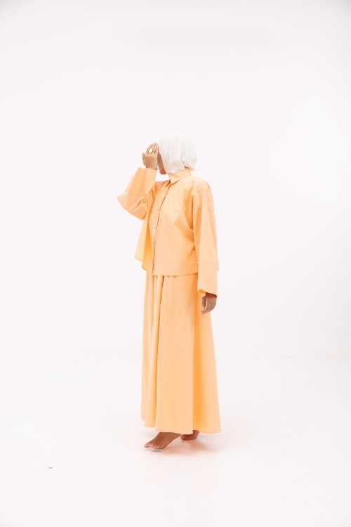 The Lilou ensemble seduces with its trendy, assertive look. It features a short shirt with wide sleeves, buttoned at the front with pretty pearly buttons, and a matching puffed skirt with elastic waistband for added comfort. A modern, feminine silhouette, ideal for the season.