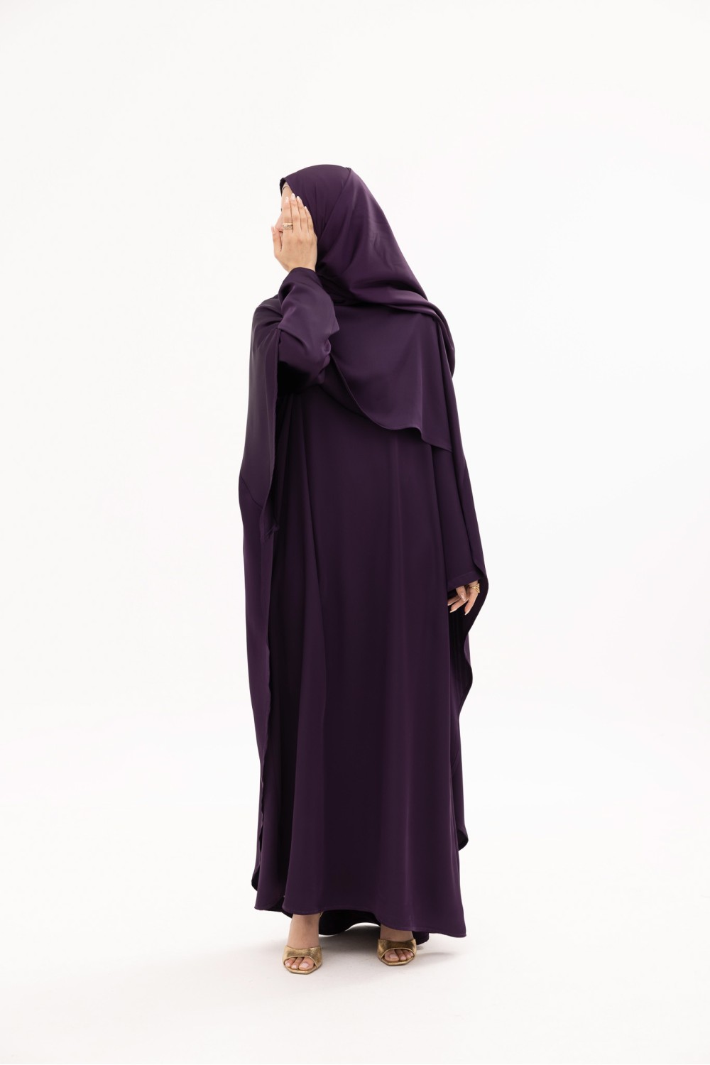 The Mina dress is a two-piece design. The dress features a slightly flared cut with straight sleeves. It is accompanied by a removable cape, designed to be worn over the dress or separately. The cape has a high neckline and closes at the back with a discreet button. The set allows for different styling options, either as a complete look or in a more minimalist version, depending on the desired effect.