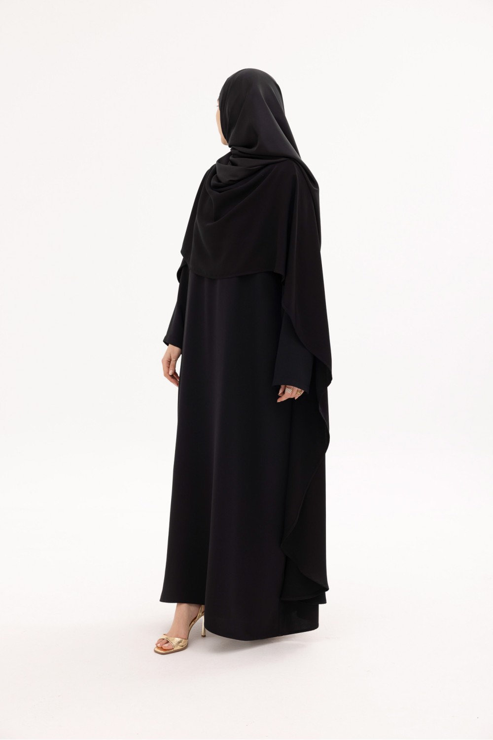The Mina dress is a two-piece design. The dress features a slightly flared cut with straight sleeves. It is accompanied by a removable cape, designed to be worn over the dress or separately. The cape has a high neckline and closes at the back with a discreet button. The set allows for different styling options, either as a complete look or in a more minimalist version, depending on the desired effect.