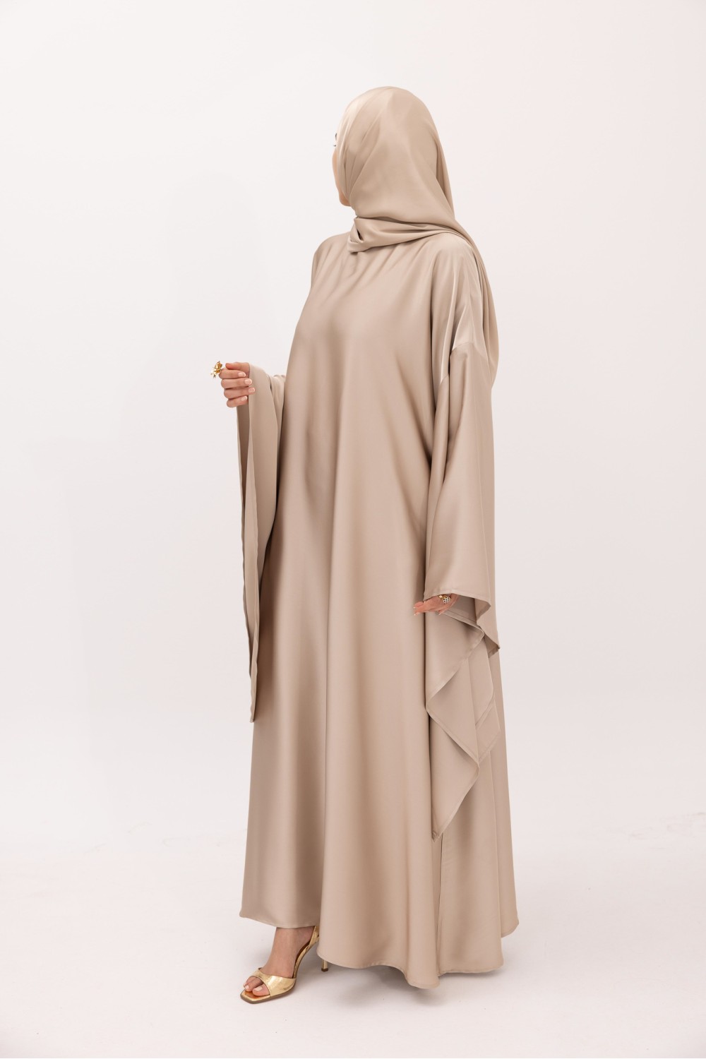 The Sana dress features a modern look, designed for events and special occasions. The model has a high neckline, fastened at the back with a discreet button for a refined finish. The uniqueness of the piece lies in its ultra-wide sleeves, which give the silhouette a strong presence and a majestic shape. The dress can be worn loose or belted depending on the desired style; the belt is sold separately. The combination of fabrics has been carefully crafted, giving the piece richness and character.