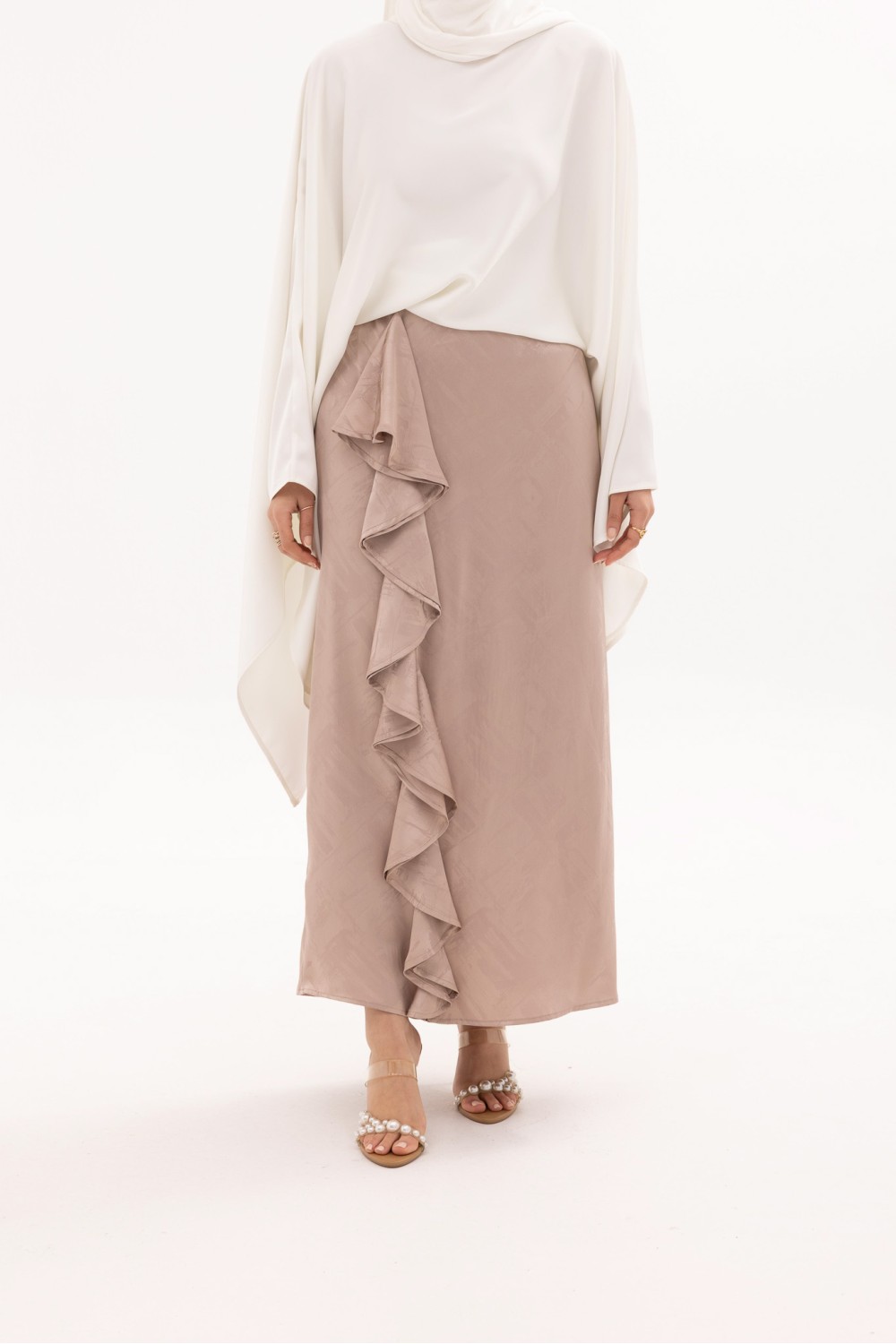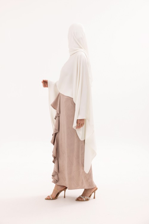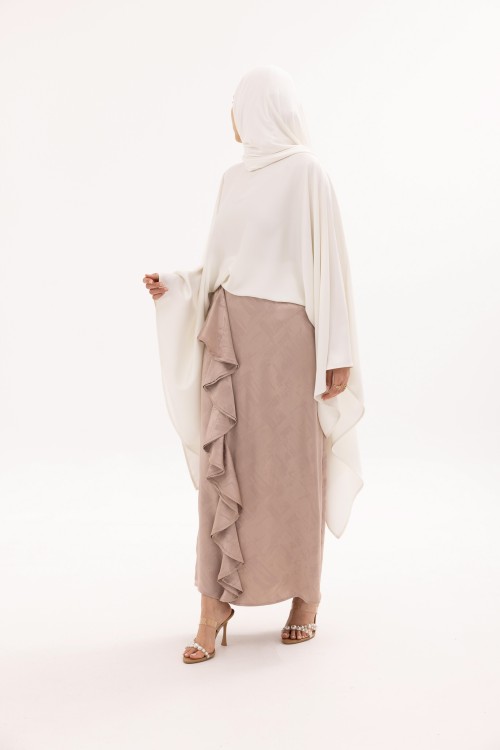 Its distinctive detail lies in the ruffles placed at the front, which add elegance and refined craftsmanship, creating a dressy look without being overdone.