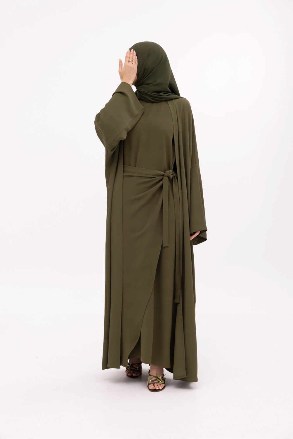 The under-abaya is designed with a wrap effect, inspired by a wrap skirt, adding detail and dimension to the overall look.