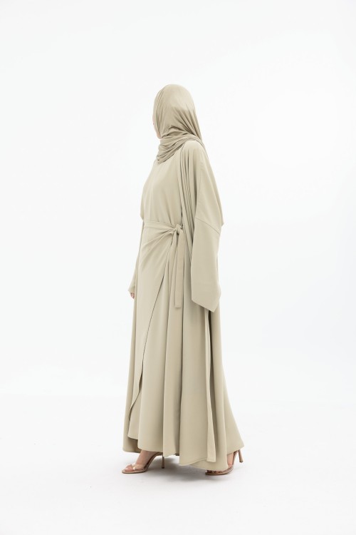 The under-abaya is designed with a wrap effect, inspired by a wrap skirt, adding detail and dimension to the overall look.