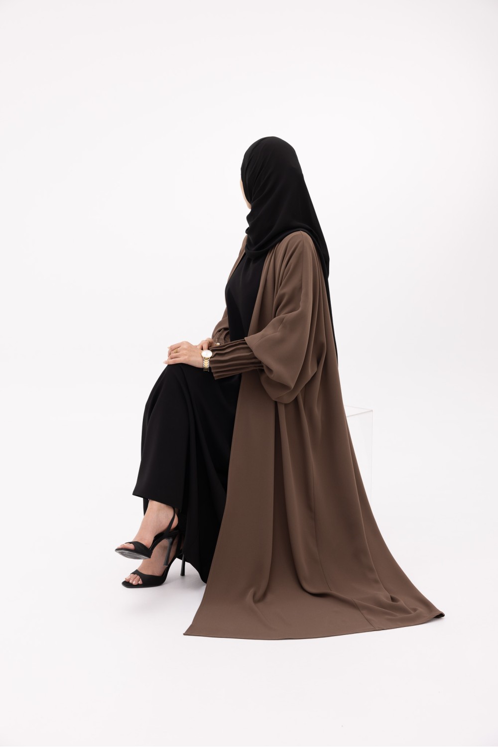 The Adela abaya features a straight, slightly flared cut, designed for a structured, clean silhouette.