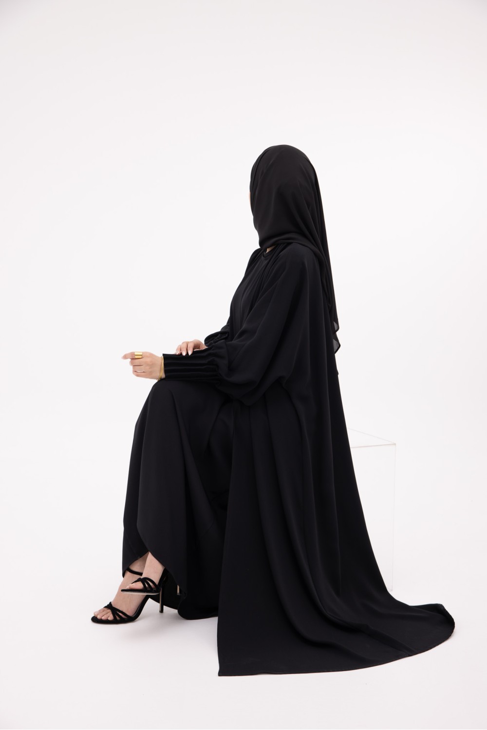 The Adela abaya features a straight, slightly flared cut, designed for a structured, clean silhouette.