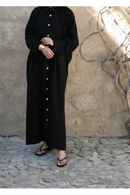 Elle dispo de boutons nacrés sur toute la longueur afin de se porter totalement fermée en robe, ou en kimono sur un palazzo ou sous abaya.
