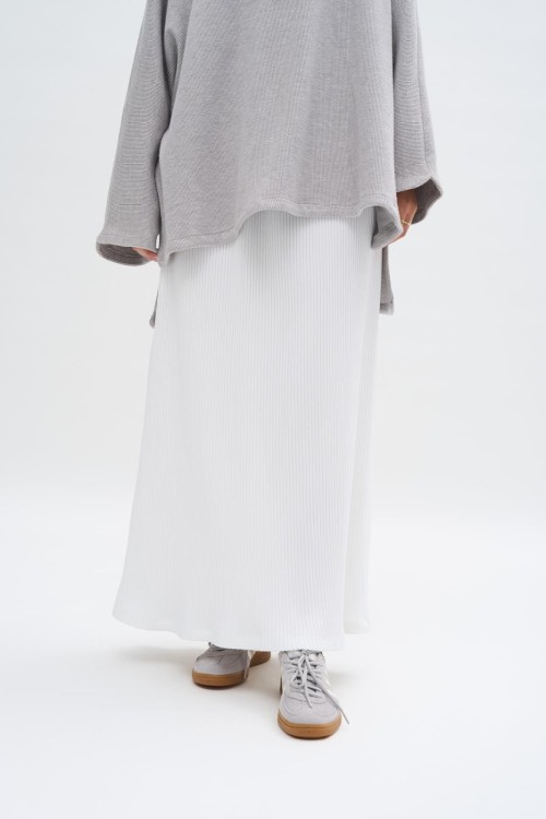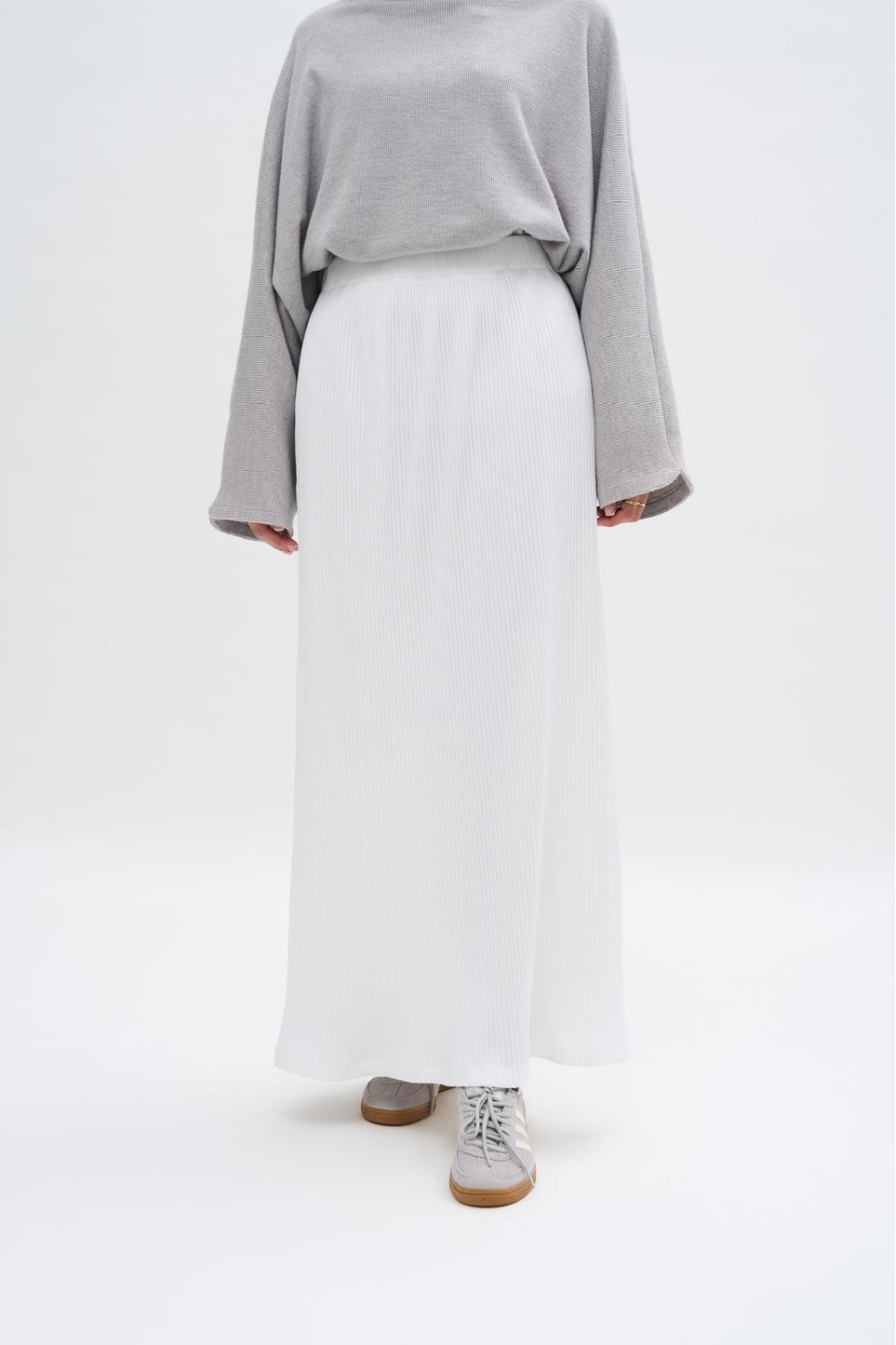 Cette jupe est en tissu côtelée et dispose d'une coupe droite et d'un élastique à la taille.