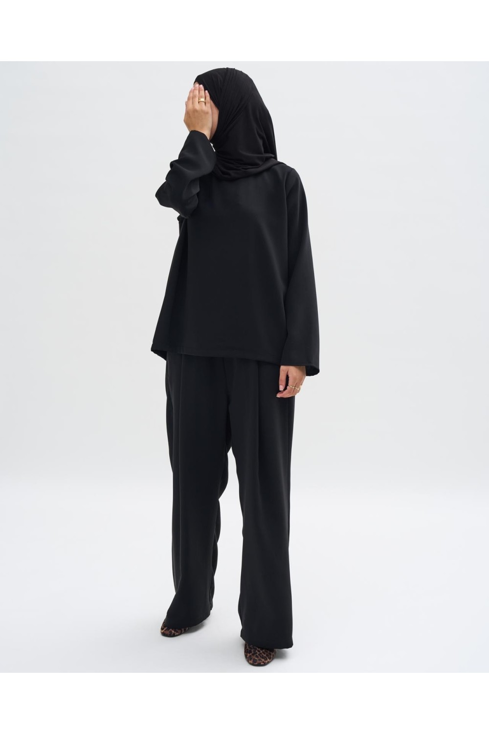 En crêpe de soire corréenne mate, il est composé d'un haut manches longues et d'un palazzo qui dispose de deux poches et un élastique à l'arrière.