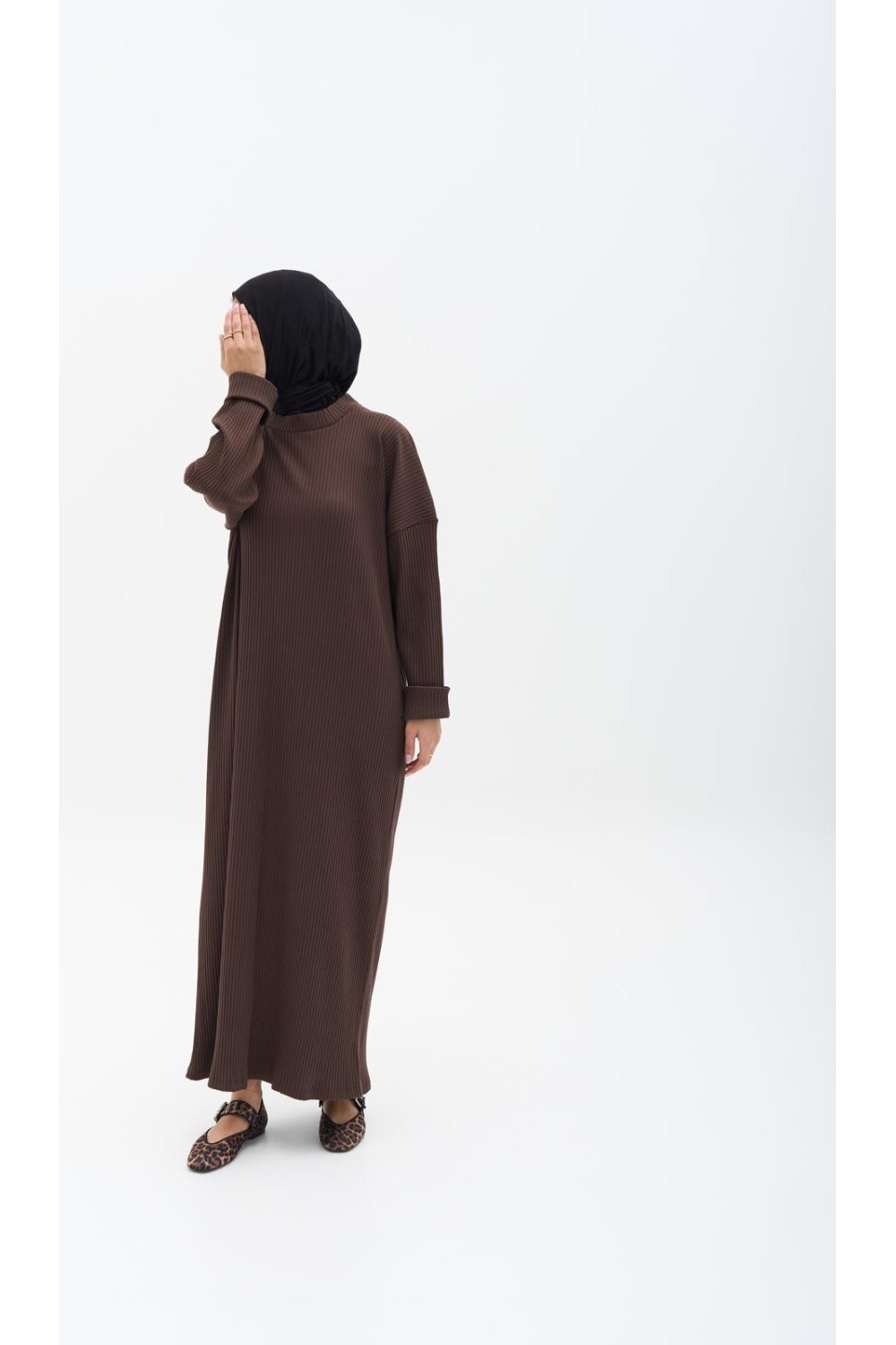 Notre robe côtelée séduit par sa simplicité élégante et sa coupe droite intemporelle. Dotée d’un col rond et de manches subtilement retroussées, elle est confectionnée en maille côtelée de haute qualité, alliant confort et style.