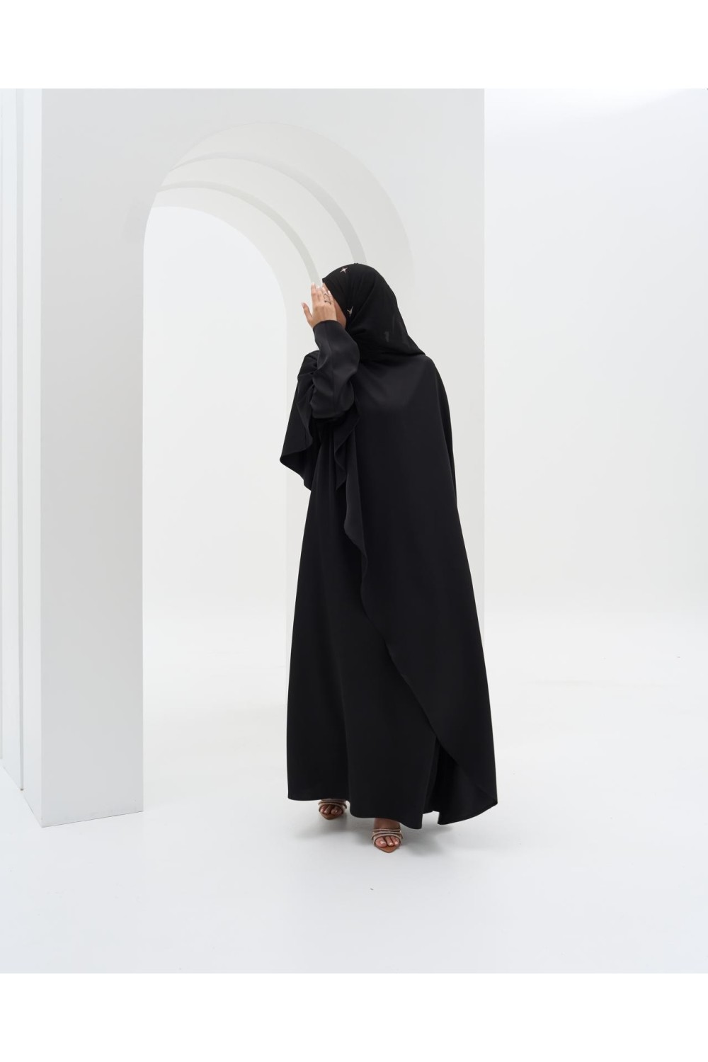 La cape est asymétrique et son retombé est incroyable ! Elle s’enfile par dessus la robe, ce sont deux pièces distinctes, vous pourrez donc également porter la robe seule si vous le souhaitez.