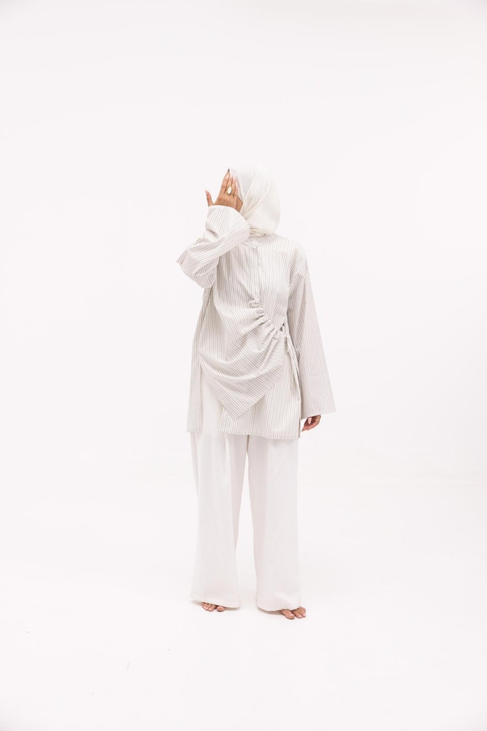 Julia séduit par son design minimaliste et sa touche d’originalité. Derrière son apparente simplicité se cache un détail signature : un fil discret placé à l’avant et sur le côté de la chemise permet de créer un élégant plissé asymétrique. Ce jeu de volume subtil apporte une touche moderne et raffinée. Minimaliste, mais jamais basique.