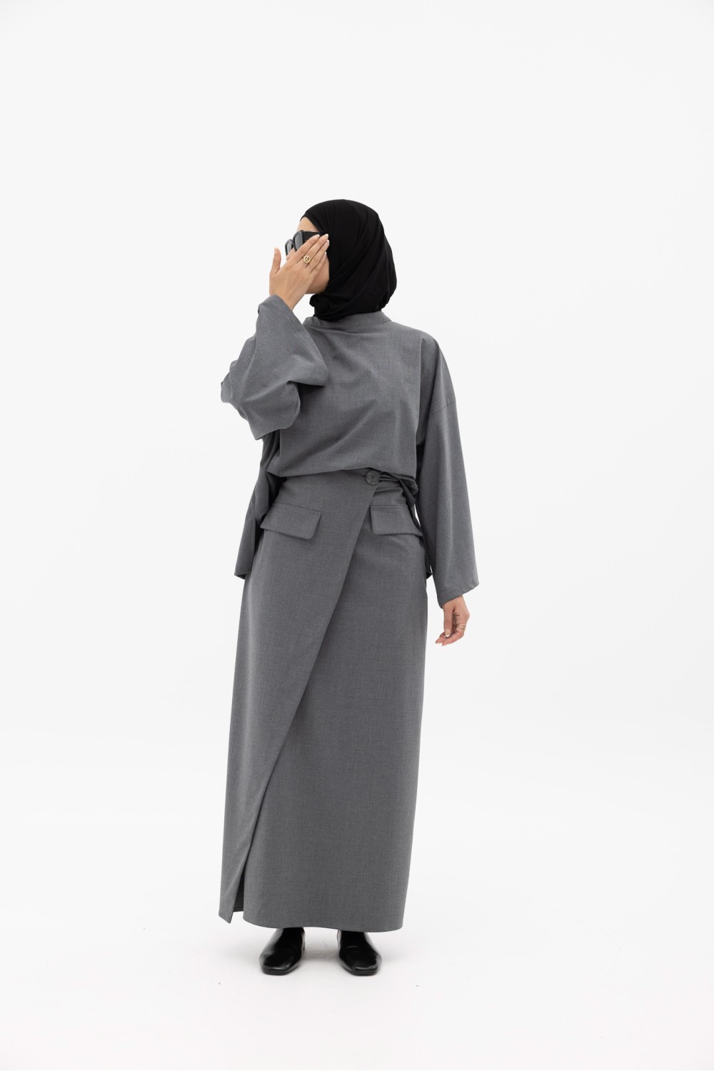 Il s’accompagne d’une jupe portefeuille au design unique, dotée d’un rabat, de deux poches et d’un bouton latéral. L’élastique à l’arrière assure un ajustement confortable et adapté.