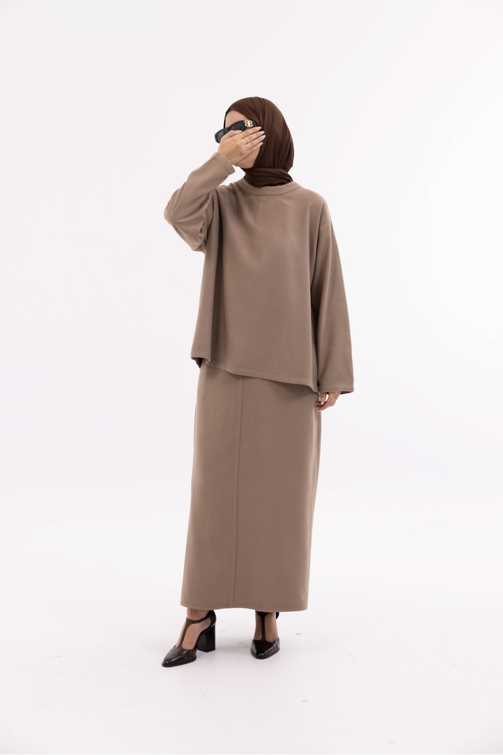 L’ensemble Lou se compose d’un haut à manches longues et d’un bas au choix — jupe ou palazzo. Confortable et bien coupé, il s’impose comme un indispensable du vestiaire hivernal. Conçu dans une matière douce et agréable, il se porte aussi bien avec la abaya Lou qu’en dessous d’un manteau. Sa qualité et sa tenue en font une pièce faite pour durer au fil des saisons.