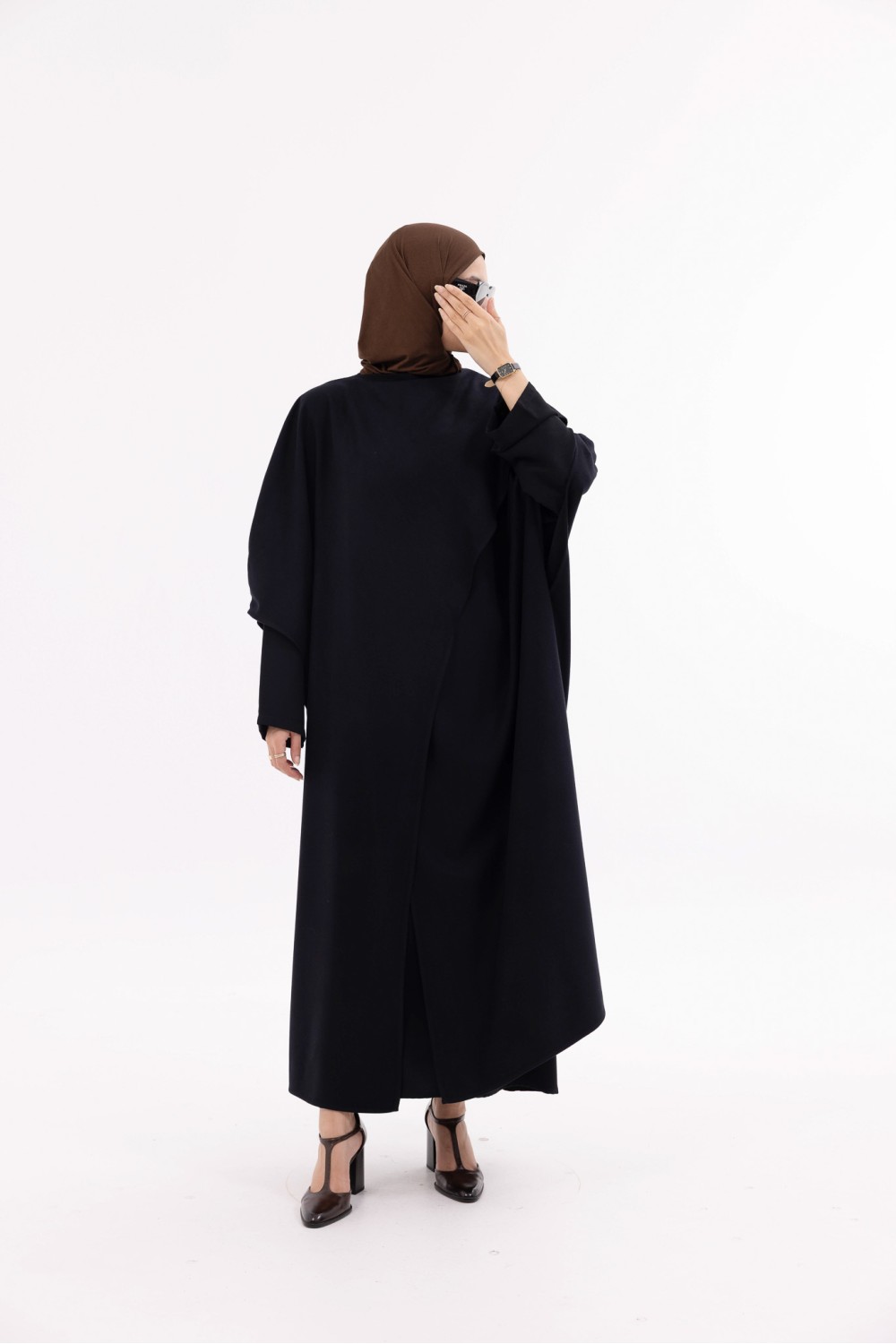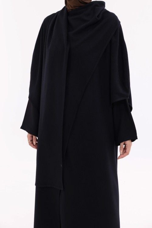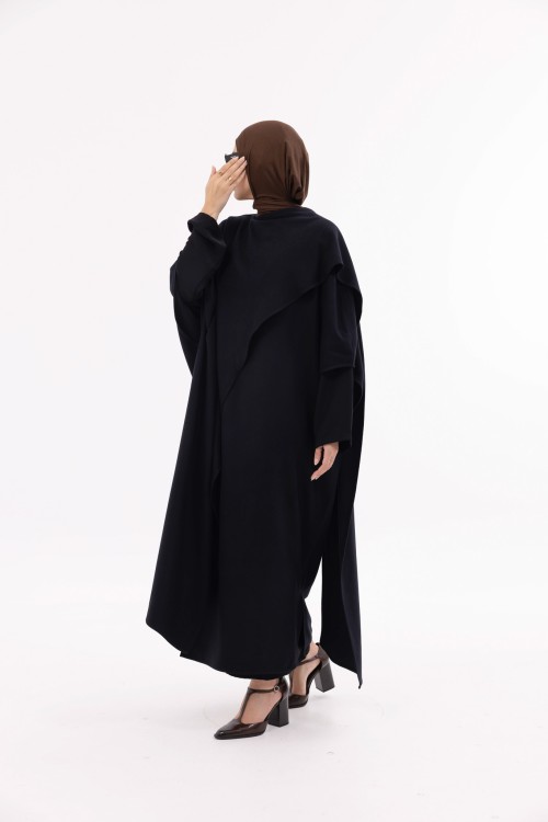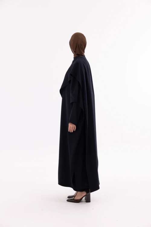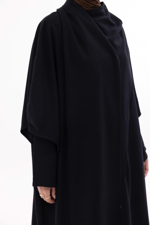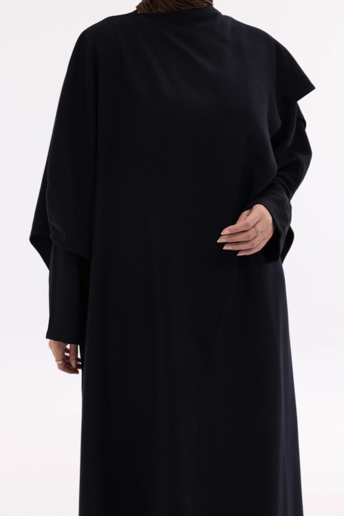 La cape Léa est une longue cape au design élégant et structuré. Fermée au niveau du col, elle se rabat sur un côté pour créer un effet drapé, dans l’esprit d’une grande écharpe. Elle dispose d’ouvertures au niveau des manches pour plus de praticité et d’aisance. Sa coupe fluide et son tombé naturel en font une pièce chic et facile à porter, adaptée à toutes les morphologies.