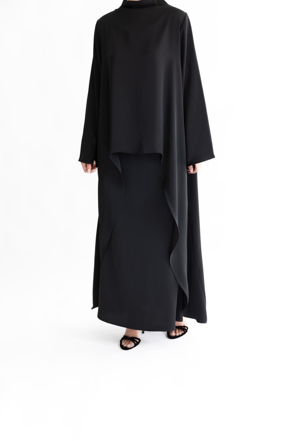 Cape asymétrique en drap de soie, elle dispose d'un col haut qui se ferme à l'aide d'un bouton et manches ajustées.
