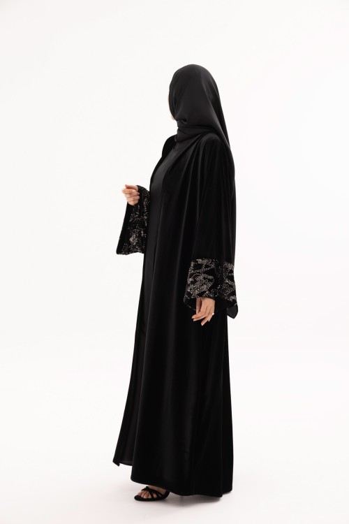 Laura est une abaya noire à la coupe ample, confectionnée en velours. La silhouette est volontairement épurée, avec un travail précis porté sur les finitions. Les manches sont soulignées par des bandes réalisées dans un tissu d’exception perlé, apportant toute la singularité de la pièce. L’abaya joue sur l’équilibre entre sobriété de la coupe et richesse du détail, pour une allure à la fois maîtrisée et affirmée.