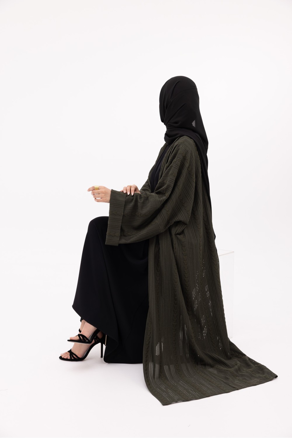 Son motif apporte du relief et structure la pièce, tout en laissant apparaître un jeu de transparence subtil. Une abaya légère, pensée pour la saison.